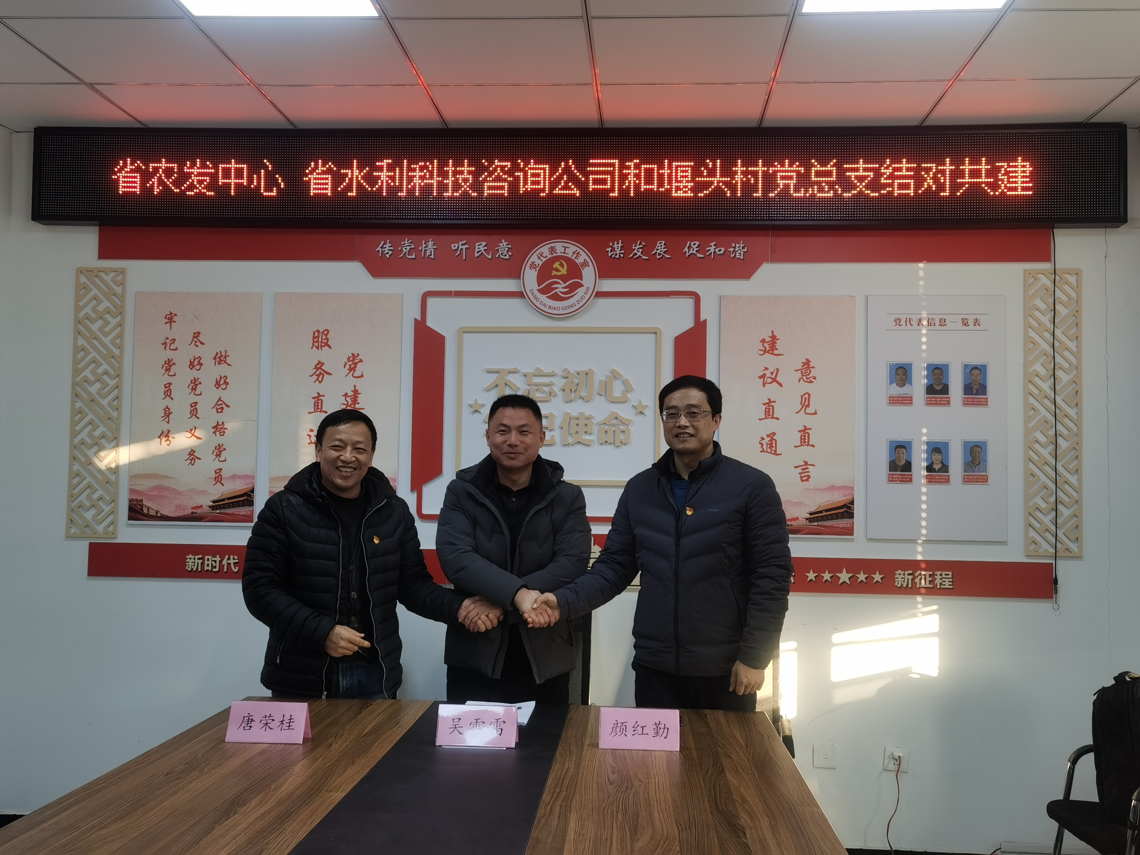 1月13日,公司黨支部書記、董事長兼總經(jīng)理顏紅勤與省農(nóng)村水利科技發(fā)展中心黨支部書記、主任唐榮桂共同帶領(lǐng)相關(guān)工作人員,前往新沂市草橋鎮(zhèn)堰頭村開展結(jié)對共建活動。 本次活動以加強支部共學(xué)共進(jìn)為主題,共建三方分別介紹了支部情況,并就黨建與業(yè)務(wù)開展情況及下階段工作安排進(jìn)行了交流座談,提出了共建目標(biāo)與具體方案。 顏紅勤在座談會上表示,共建是各方相互學(xué)習(xí)的重要途徑,我們將全力支持此項活動,以黨建促聯(lián)建,以聯(lián)建促發(fā)展。我們將充分發(fā)揮水利咨詢單位的資源優(yōu)勢,配合堰頭村在完善村莊規(guī)劃布局、環(huán)境綜合整治布點等方面進(jìn)行綜合規(guī)劃,用實際行動為堰頭村建設(shè)作貢獻(xiàn)。